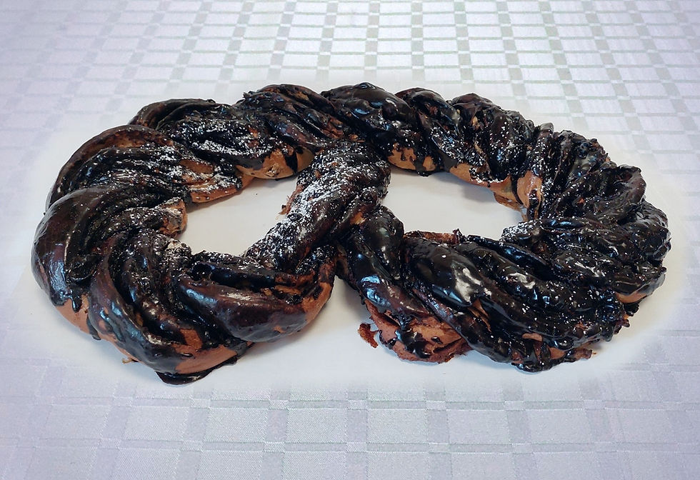 Keedukreemi-, kaneeli-, rosinatäidise ja kakaoglasuuriga kringel
